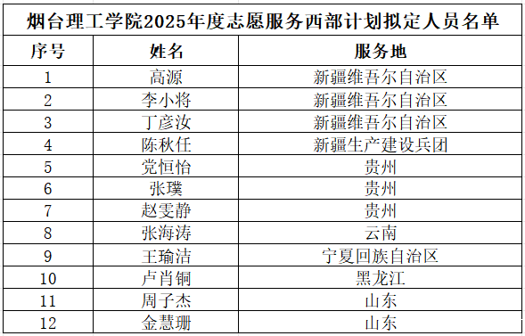 按照全国项目办《2025-2026年度大学生志愿服务西部计划实施方案》和山东省大学生志愿服务西部计划项目办相关要求,经个人申报,各学院组织推荐,校团委笔试、面试、体检等程序,共12名毕业生拟入选我校2025年志愿服务西部计划志愿者,现予以公示,如有疑义可拨打电话反映。
