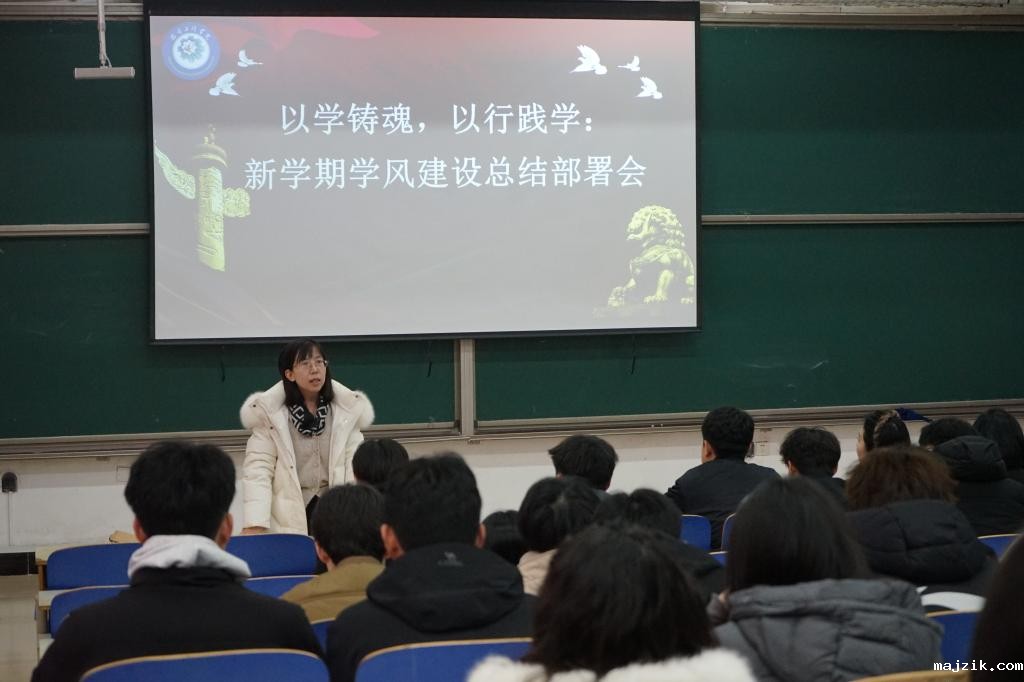 最后,韩聪聪老师充分肯定学院过去一年在学风建设方面的成果,强调学风建设仍有提升空间,学生干部要发挥带头作用,抓好自身学习,合理规划时间、明确目标,提升自主学习能力。同时,积极营造浓厚学习氛围,组织学习小组、经验分享会和学术讲座等活动,带动同学共同进步,关注同学学习状态,协助老师做好教学反馈,助力优化学院学风,以良好学风推动同学们成长进步。