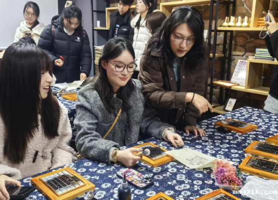 建2406-2班学生首站抵达和万家社区。一场爱国主题电影放映,瞬间拉近了学生与社区的情感距离,家国情怀如细雨般浸润心田。在乡愁体验馆,学生们亲手体验活字印刷、古法造纸。墨香四溢间,指尖触摸的不只是凹凸的文字,更是千年文明的血脉传承。走进和美书院,精巧的非遗手工作品琳琅满目,用现代数字技术传承非遗,是新时代学生对非遗传承的回应。